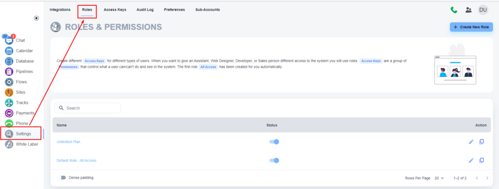 Please, navigate to the ‘Settings’ on the left menu bar. Once the page is opened, please click on the ‘Role’ menu on the top bar.