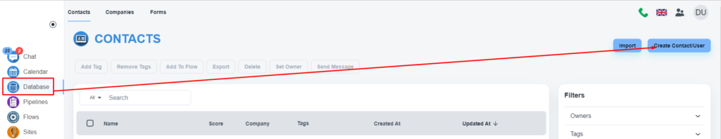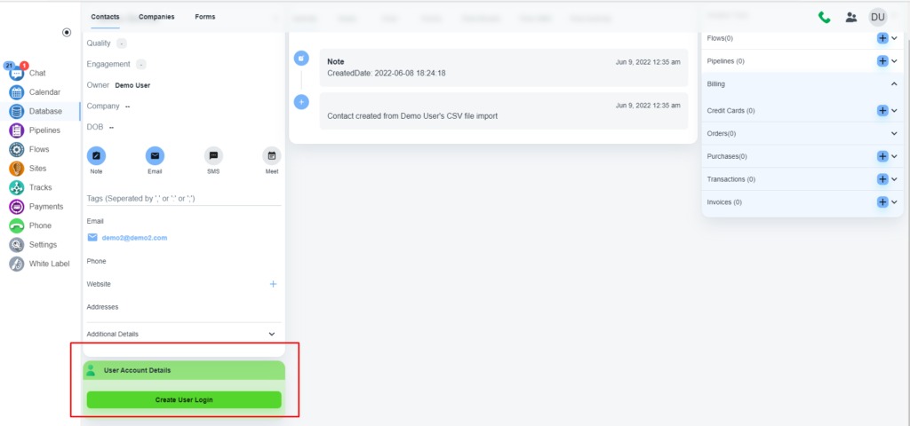 Please, create a contact for the user if you don’t have that already. Please, click on the ‘Database’ menu on the left menu bar. Once the page is loaded, click on the ‘Create Contact/User’ button.